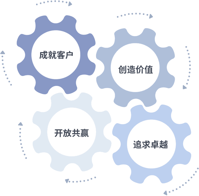 成就客户是一切决策的出发点,,,,创造价值是衡量所有工作的标准,,,追求卓越是我们做事做人的态度,,,,开放共赢是我们的格局也是最终的结果。。。价值观的齿轮环环相扣,,,推动着组织里的每个人不断向前。。。。